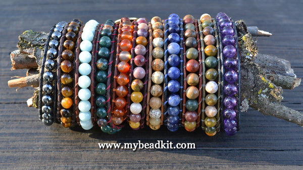 Check out our latest collection of Leather Wrap Bracelet Kits featuring genuine 6mm semi-precious stones! Choose from Amethyst, Red Creek Jasper, Sodalite, Amazonite, Mookaite and many more favorites!